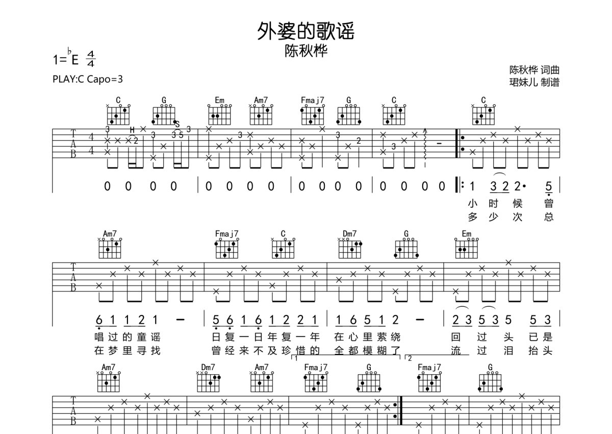 陈秋桦《外婆的歌谣》吉他谱 - C调弹唱六线谱