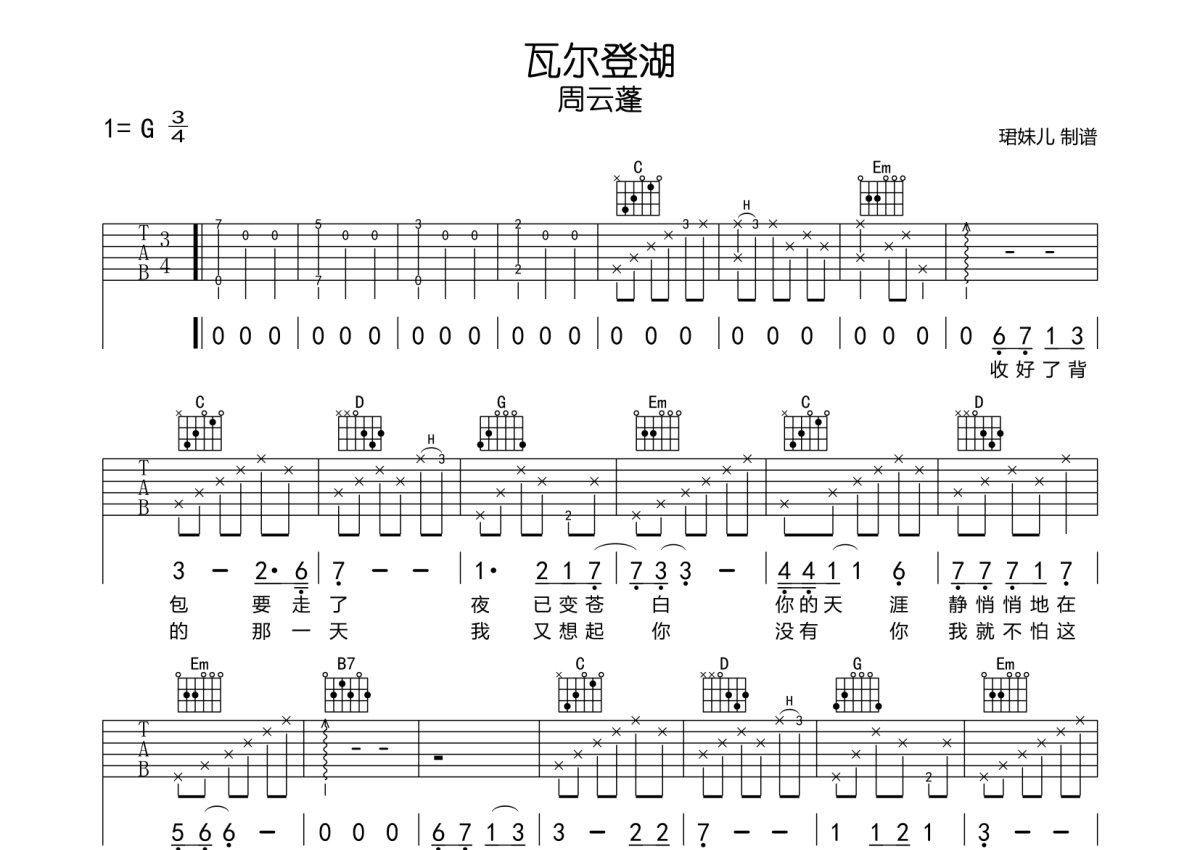 周云蓬《瓦尔登湖》吉他谱 - G调弹唱六线谱