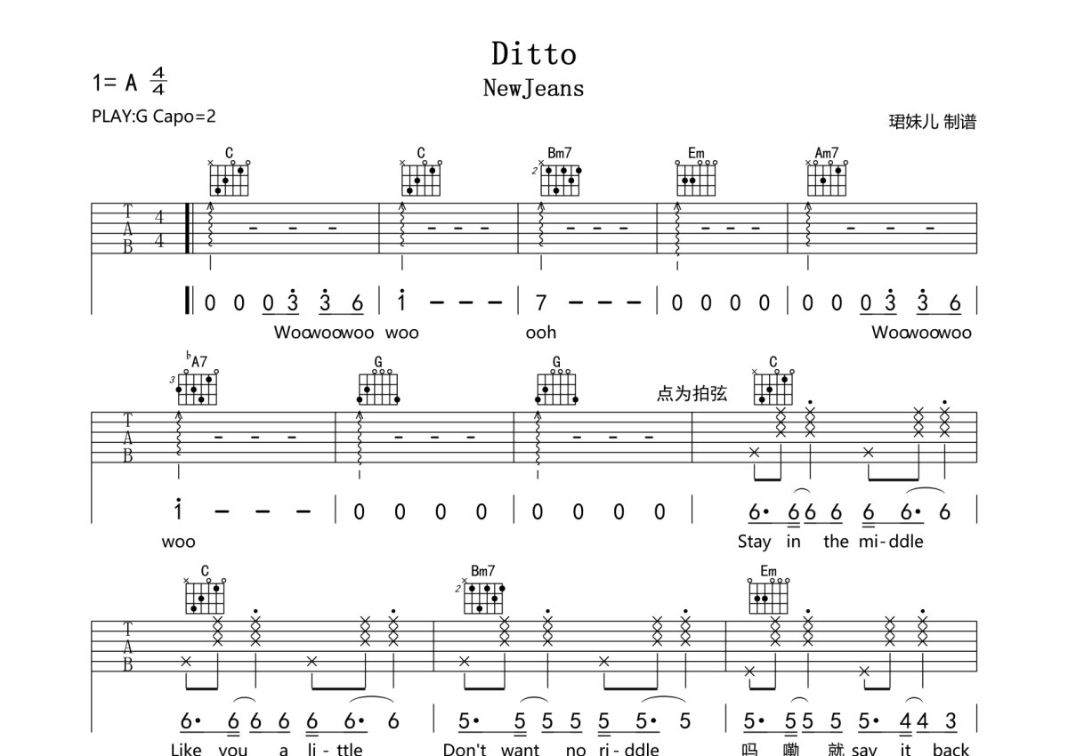 NewJeans《Ditto》吉他谱 - G调弹唱六线谱