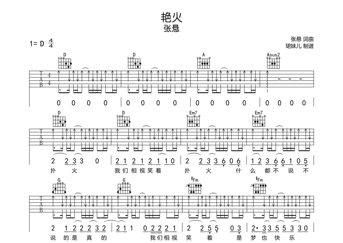 张悬《艳火》吉他谱 - D调弹唱六线谱