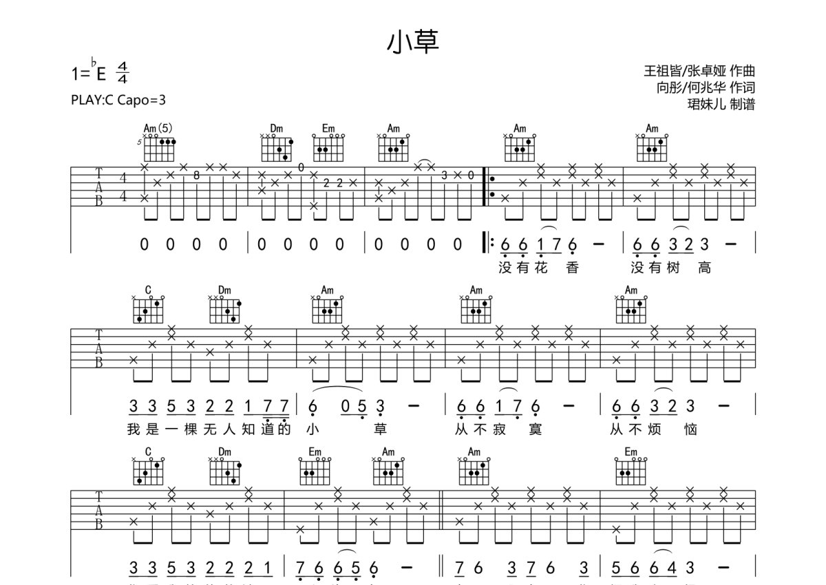 《小草》是儿歌演唱的一首歌曲,本吉他谱采用的是C调指法编配,这份吉他谱共有两张高清图谱,图谱由 @珺妹儿 编配上传,图谱使用六线谱编配,包含吉他和弦指法、简谱以及歌词部分,使用这份小草吉他谱,可以让你更加方便地掌握这首歌曲的弹唱技巧,快来尝试吧。采用C调指法编配,弹唱建议变调夹3品,速度75BPM难度较简单,易上手。