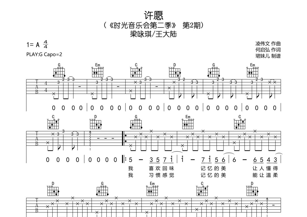 梁咏琪/王大陆《许愿》吉他谱 - G调弹唱六线谱