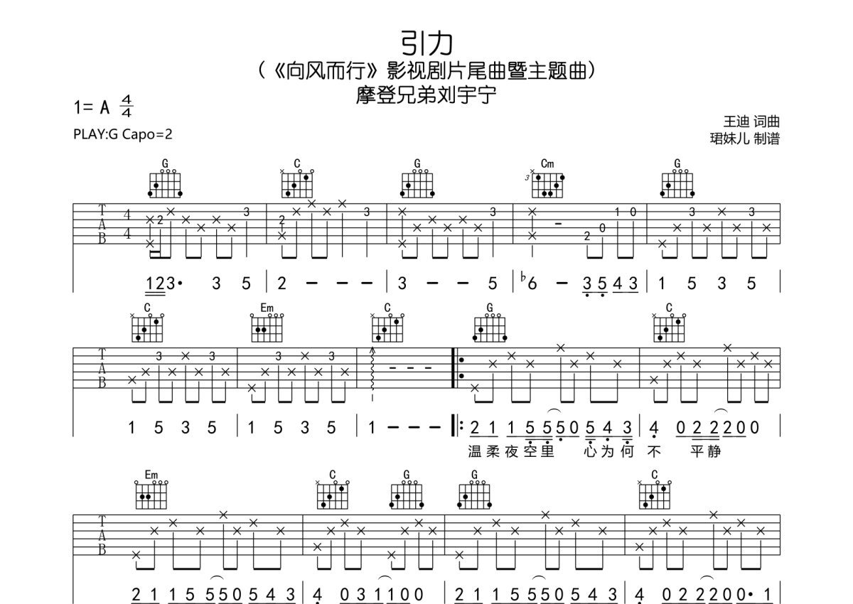 《引力》是摩登兄弟刘宇宁演唱的一首歌曲,本吉他谱采用的是G调指法编配,这份吉他谱共有两张高清图谱,图谱由 @珺妹儿 编配上传,图谱使用六线谱编配,包含吉他和弦指法、简谱以及歌词部分,使用这份引力吉他谱,可以让你更加方便地掌握这首歌曲的弹唱技巧,快来尝试吧。采用G调指法编,弹唱建议变调夹2品,配速度65BPM难度较简单,易上手。