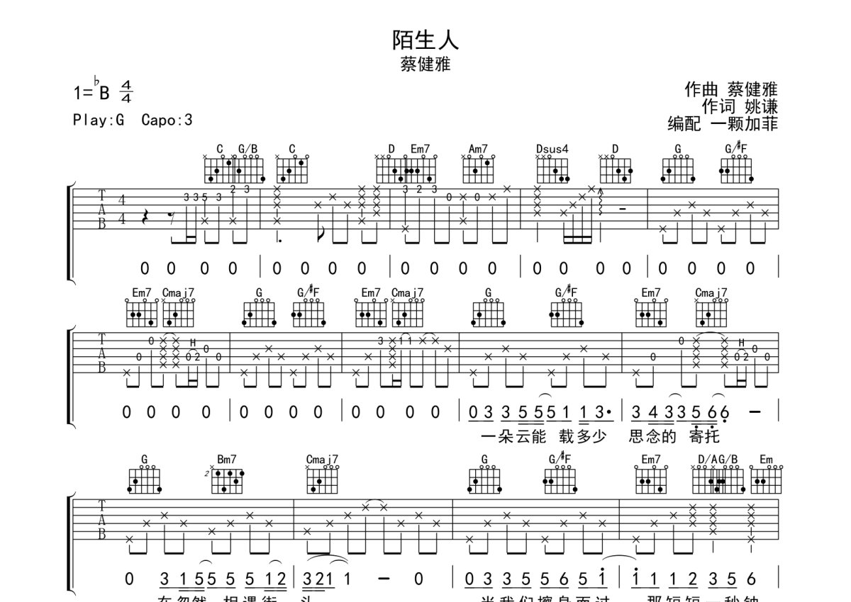 蔡健雅《陌生人》吉他谱 - G调弹唱六线谱 - 完整编配版