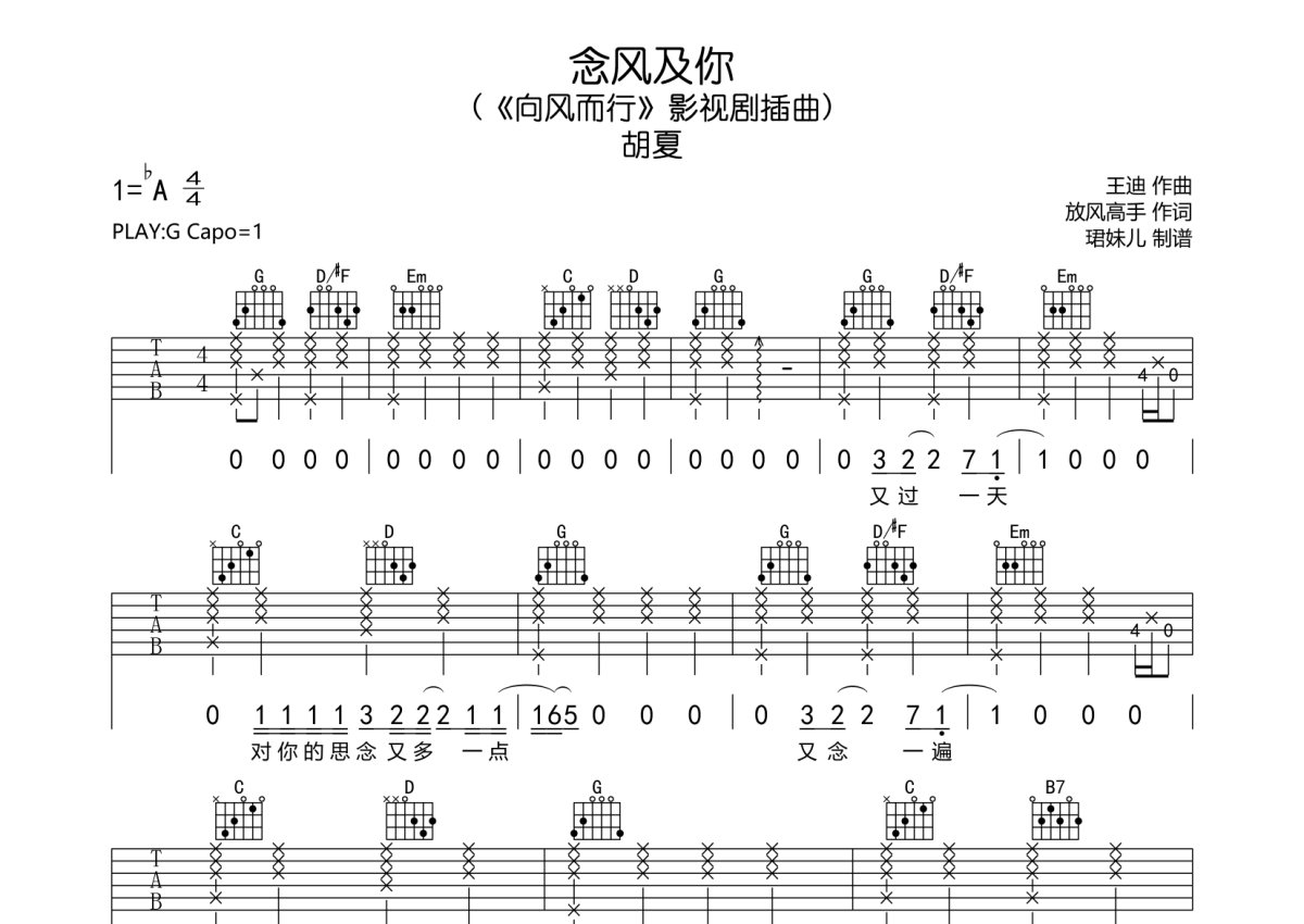 《念风及你》是胡夏演唱的一首歌曲,本吉他谱采用的是G调指法编配,这份吉他谱共有三张高清图谱,图谱由 @珺妹儿 编配上传,图谱使用六线谱编配,包含吉他和弦指法、简谱以及歌词部分,使用这份念风及你吉他谱,可以让你更加方便地掌握这首歌曲的弹唱技巧,快来尝试吧。(《向风而行》影视剧插曲),采用G调指法编,弹唱建议变调夹1品,配速度85BPM难度较简单,易上手。