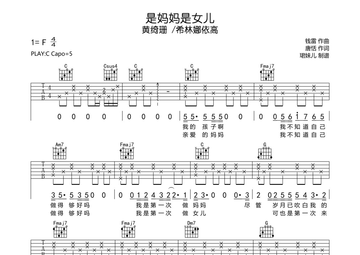 《是妈妈是女儿》是黄绮珊/希林娜依高演唱的一首歌曲,本吉他谱采用的是C调指法编配,这份吉他谱共有四张高清图谱,图谱由 @珺妹儿 编配上传,图谱使用六线谱编配,包含吉他和弦指法、简谱以及歌词部分,使用这份是妈妈是女儿吉他谱,可以让你更加方便地掌握这首歌曲的弹唱技巧,快来尝试吧。用C调指法编,弹唱建议变调夹5品,配速度75BPM难度较简单,易上手。
