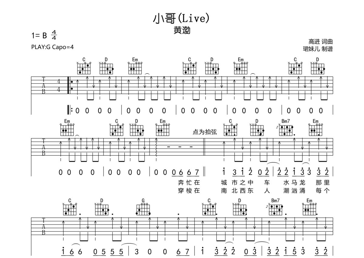 《小哥》是黄渤演唱的一首歌曲,本吉他谱采用的是G调指法编配,这份吉他谱共有两张高清图谱,图谱由 @珺妹儿 编配上传,图谱使用六线谱编配,包含吉他和弦指法、简谱以及歌词部分,使用这份小哥吉他谱,可以让你更加方便地掌握这首歌曲的弹唱技巧,快来尝试吧。用G调指法编,弹唱建议变调夹4品,配速度95BPM难度较简单,易上手。