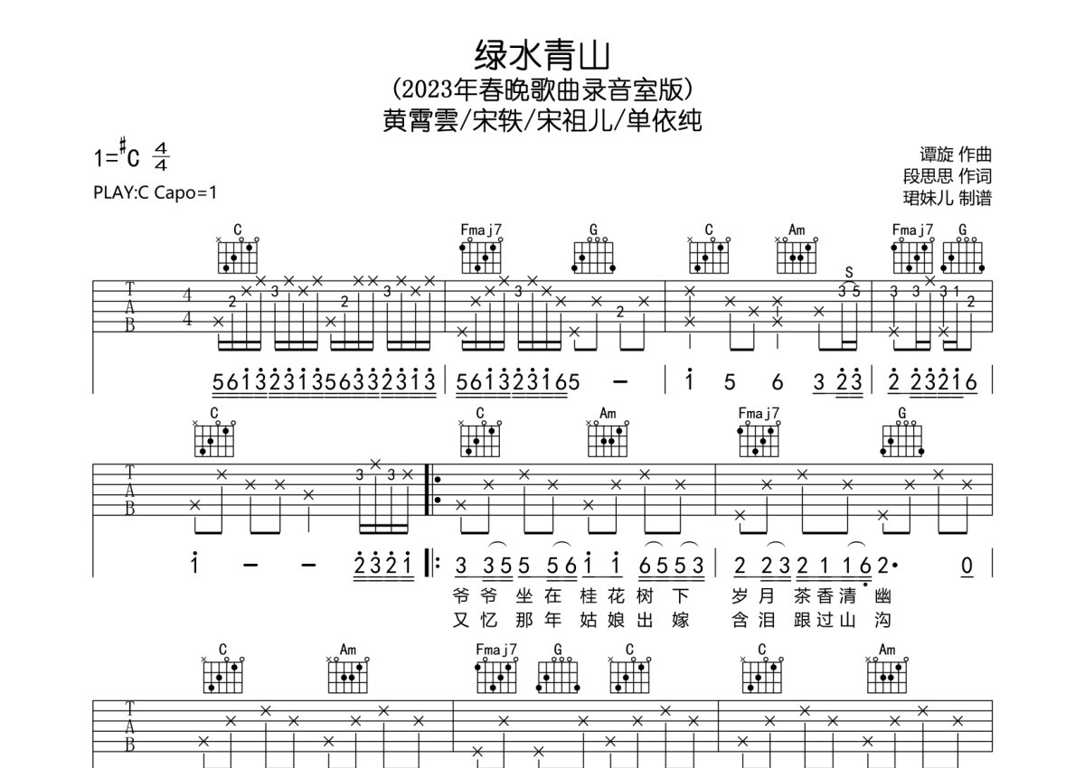 黄霄雲/宋轶/宋祖儿/单依纯《绿水青山》吉他谱 - C调弹唱六线谱