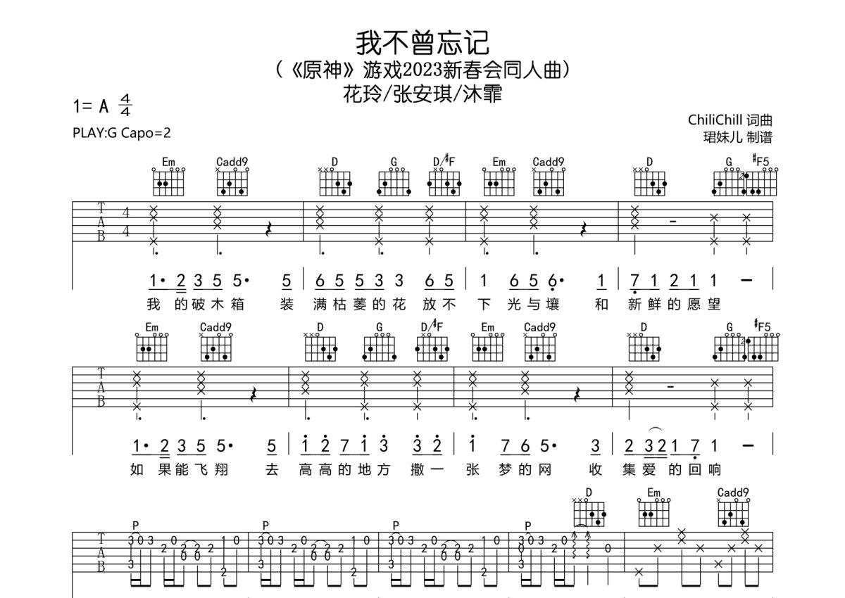 《我不曾忘记》是花玲/张安琪/沐霏演唱的一首歌曲,本吉他谱采用的是G调指法编配,这份吉他谱共有四张高清图谱,图谱由 @珺妹儿 编配上传,图谱使用六线谱编配,包含吉他和弦指法、简谱以及歌词部分,使用这份我不曾忘记吉他谱,可以让你更加方便地掌握这首歌曲的弹唱技巧,快来尝试吧。(《原神》游戏2023新春会同人曲),用G调指法编,弹唱建议变调夹2品,配速度85BPM难度较简单,易上手。