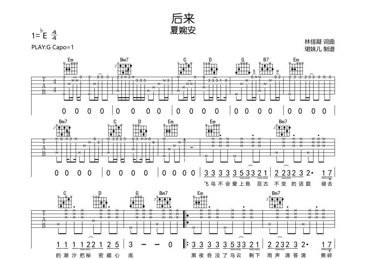 《后来》是夏婉安演唱的一首歌曲,本吉他谱采用的是G调指法编配,这份吉他谱共有两张高清图谱,图谱由 @珺妹儿 编配上传,图谱使用六线谱编配,包含吉他和弦指法、简谱以及歌词部分,使用这份后来吉他谱,可以让你更加方便地掌握这首歌曲的弹唱技巧,快来尝试吧。用G调指法编,弹唱建议变调夹1品,速度88BPM难度较简单,易上手。