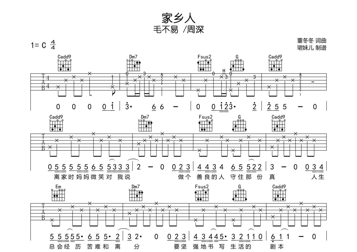 毛不易/周深《家乡人》吉他谱 - C调弹唱六线谱