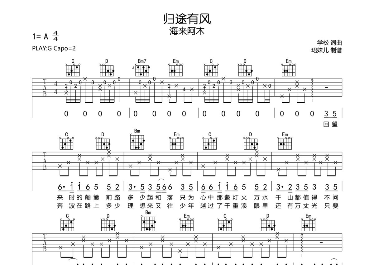 海来阿木《归途有风》吉他谱 - G调弹唱六线谱