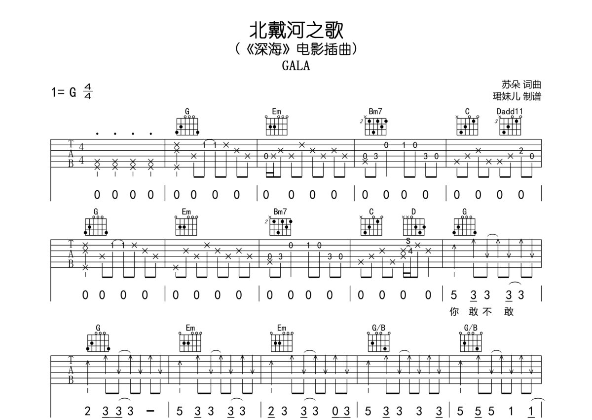 《北戴河之歌》是GALA演唱的一首歌曲,本吉他谱采用的是G调指法编配,这份吉他谱共有三张高清图谱,图谱由 @珺妹儿 编配上传,图谱使用六线谱编配,包含吉他和弦指法、简谱以及歌词部分,使用这份北戴河之歌吉他谱,可以让你更加方便地掌握这首歌曲的弹唱技巧,快来尝试吧。(《深海》电影插曲)用G调指法编,速度120BPM难度较简单,易上手。