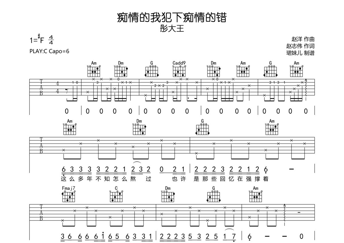 彤大王《痴情的我犯下痴情的错》吉他谱 - C调弹唱六线谱
