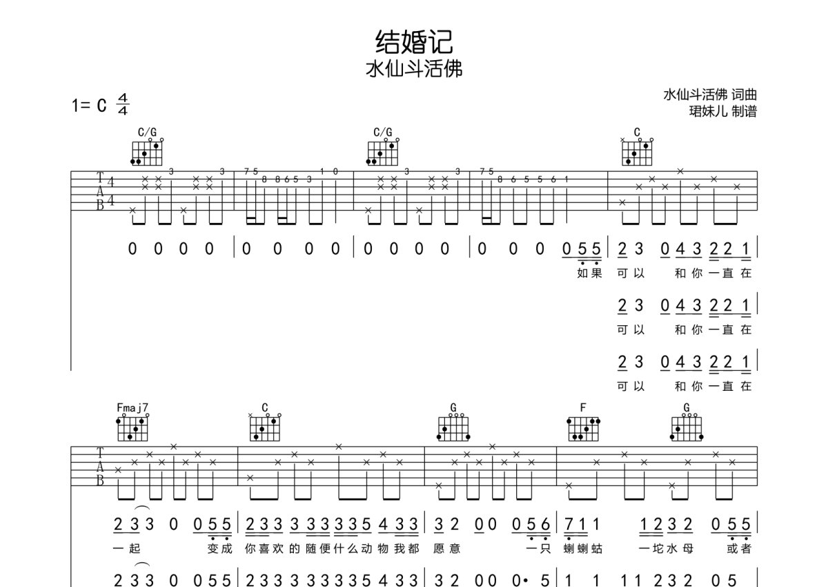 水仙斗活佛《结婚记》吉他谱 - C调弹唱六线谱