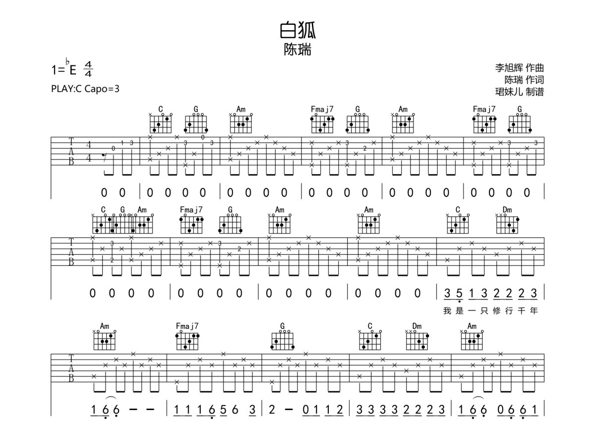 陈瑞《白狐》吉他谱 - C调弹唱六线谱