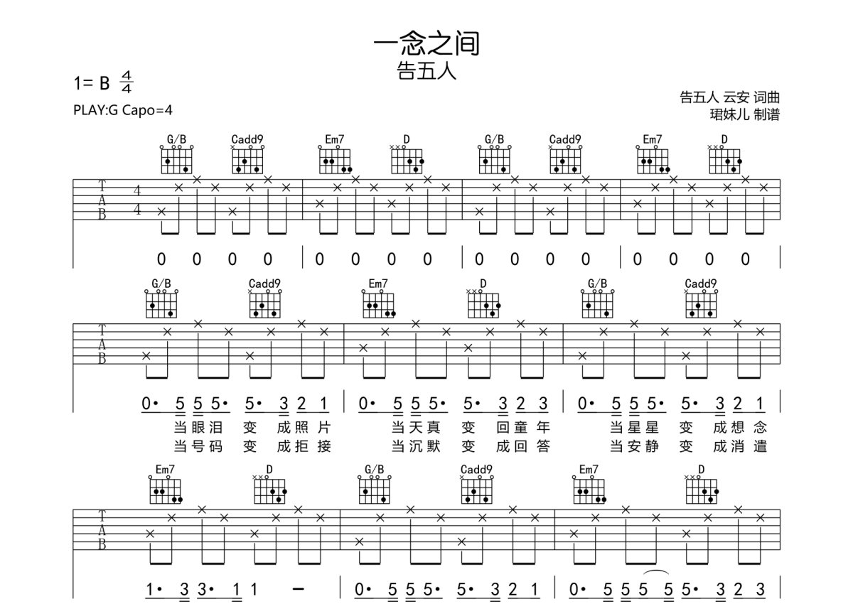 告五人《一念之间》吉他谱 - G调弹唱六线谱