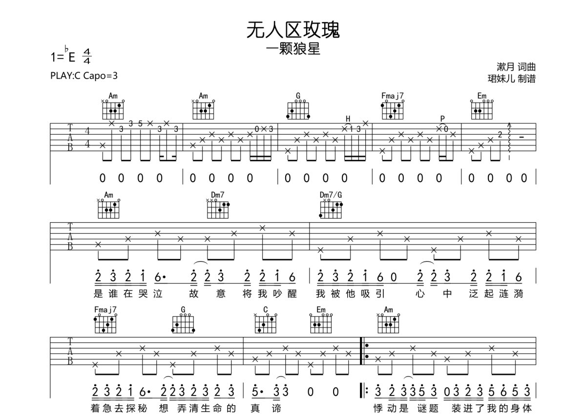 《无人区玫瑰》是一颗狼星演唱的一首歌曲,本吉他谱采用的是C调指法编配,这份吉他谱共有三张高清图谱,图谱由 @珺妹儿 编配上传,图谱使用六线谱编配,包含吉他和弦指法、简谱以及歌词部分,使用这份无人区玫瑰吉他谱,可以让你更加方便地掌握这首歌曲的弹唱技巧,快来尝试吧。采用C调指法编,弹唱建议变调夹3品,速度85BPM难度较简单,易上手。