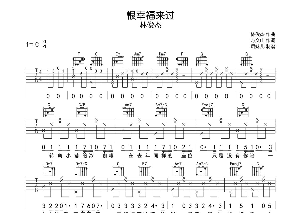 林俊杰《恨幸福来过》吉他谱 - C调弹唱六线谱