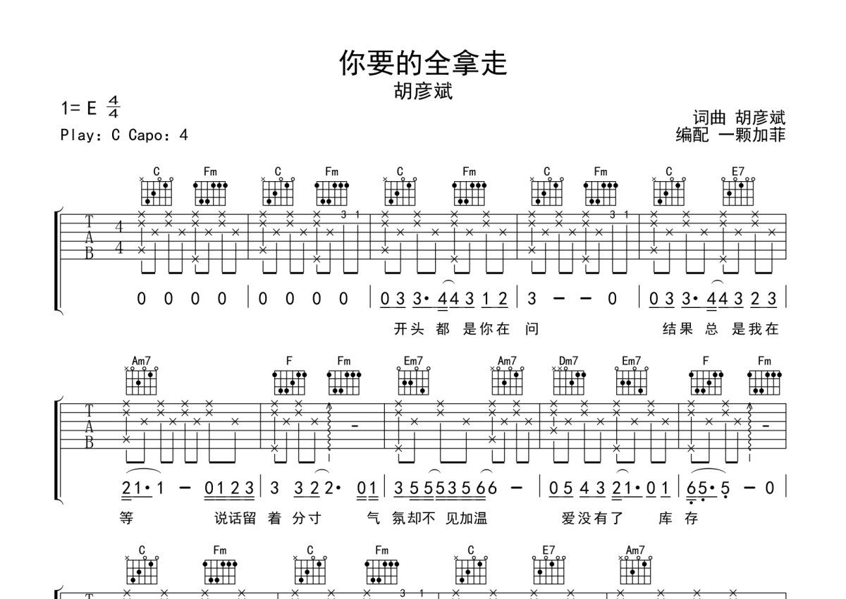 《你要的全拿走》是胡彦斌演唱的一首歌曲,完整编配版,本吉他谱采用的是C调指法编配,这份吉他谱共有五张高清图谱,图谱由 @一颗加菲 编配上传,图谱使用六线谱编配,包含吉他和弦指法、简谱以及歌词部分,曲谱配备了相关的音频提供试听,使用这份你要的全拿走吉他谱,可以让你更加方便地掌握这首歌曲的弹唱技巧,快来尝试吧。