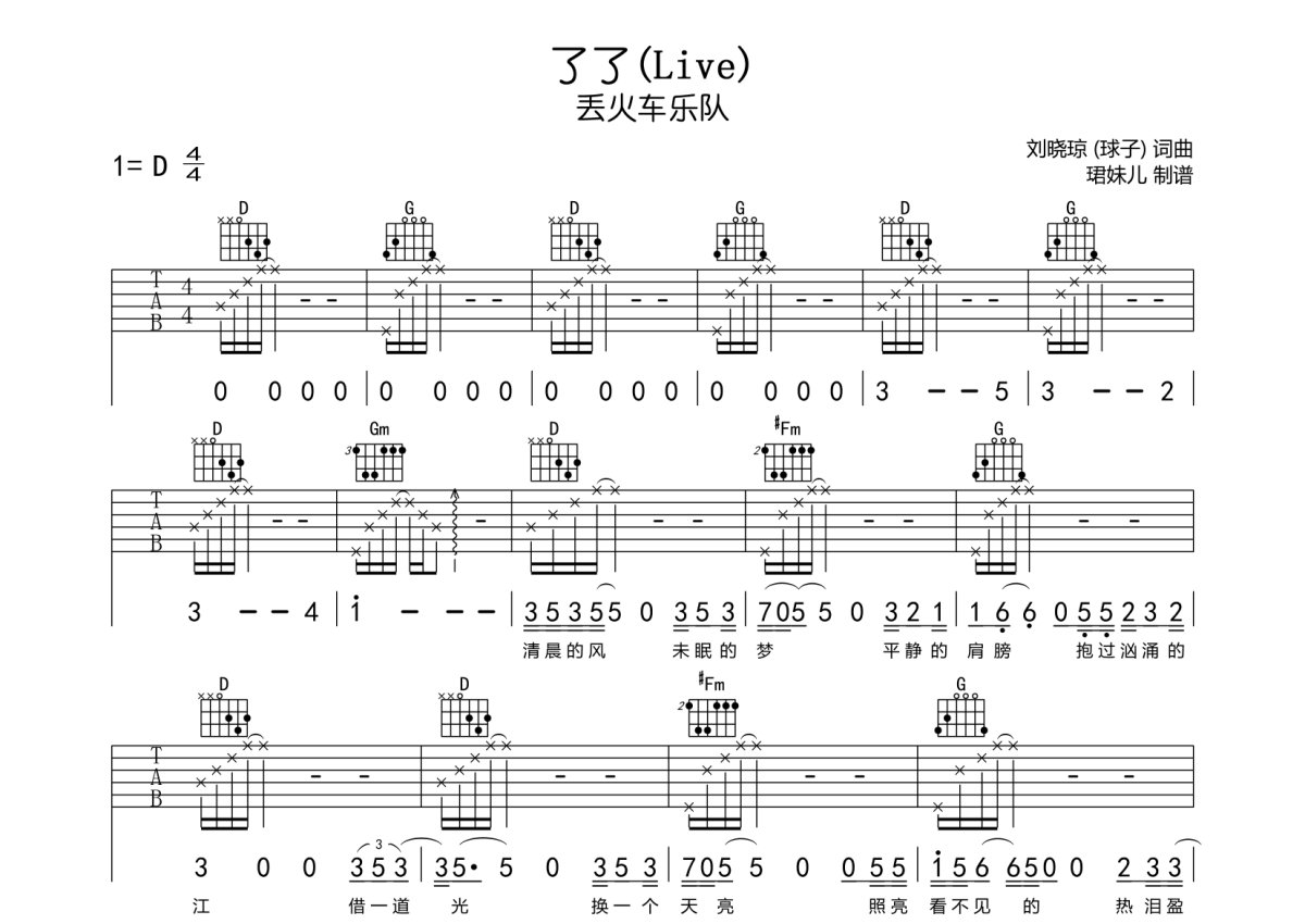 丢火车乐队《了了(Live)》吉他谱 - D调弹唱六线谱