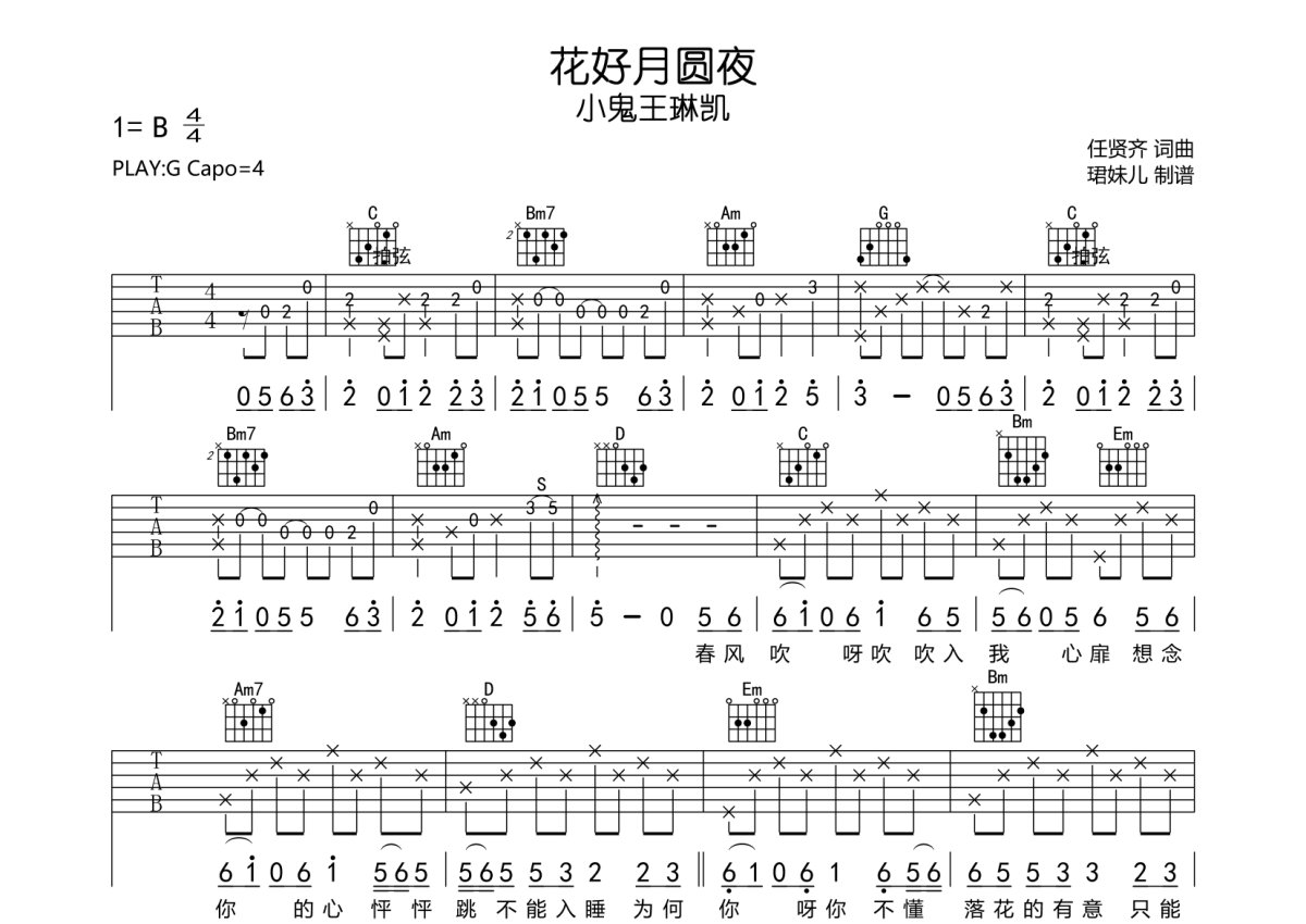 《花好月圆夜》是Lil Ghost小鬼演唱的一首歌曲,本吉他谱采用的是G调指法编配,这份吉他谱共有三张高清图谱,图谱由 @珺妹儿 编配上传,图谱使用六线谱编配,包含吉他和弦指法、简谱以及歌词部分,使用这份花好月圆夜吉他谱,可以让你更加方便地掌握这首歌曲的弹唱技巧,快来尝试吧。用G调指法编,弹唱建议变调夹4品,速度85BPM难度较简单,易上手。