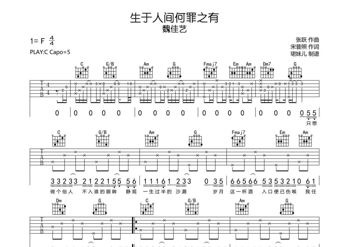 魏佳艺《生于人间何罪之有》吉他谱 - C调弹唱六线谱