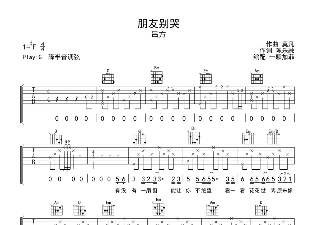 吕方《朋友别哭》吉他谱 - G调弹唱六线谱 - 完整编配版