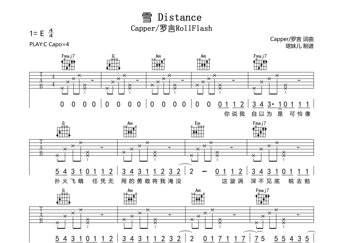 Capper/罗言RollFlash《雪 Distance》吉他谱 - G调弹唱六线谱