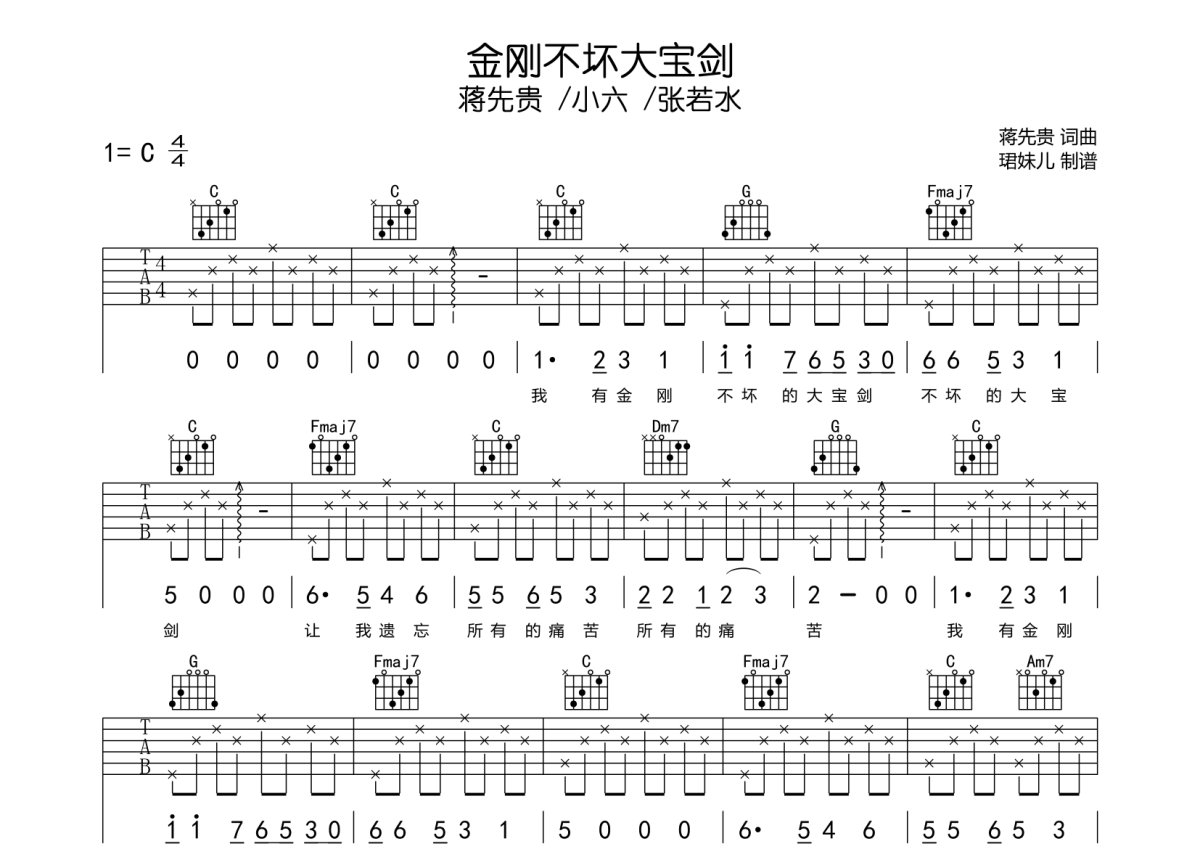 蒋先贵/小六/张若水《金刚不坏大宝剑》吉他谱 - C调弹唱六线谱