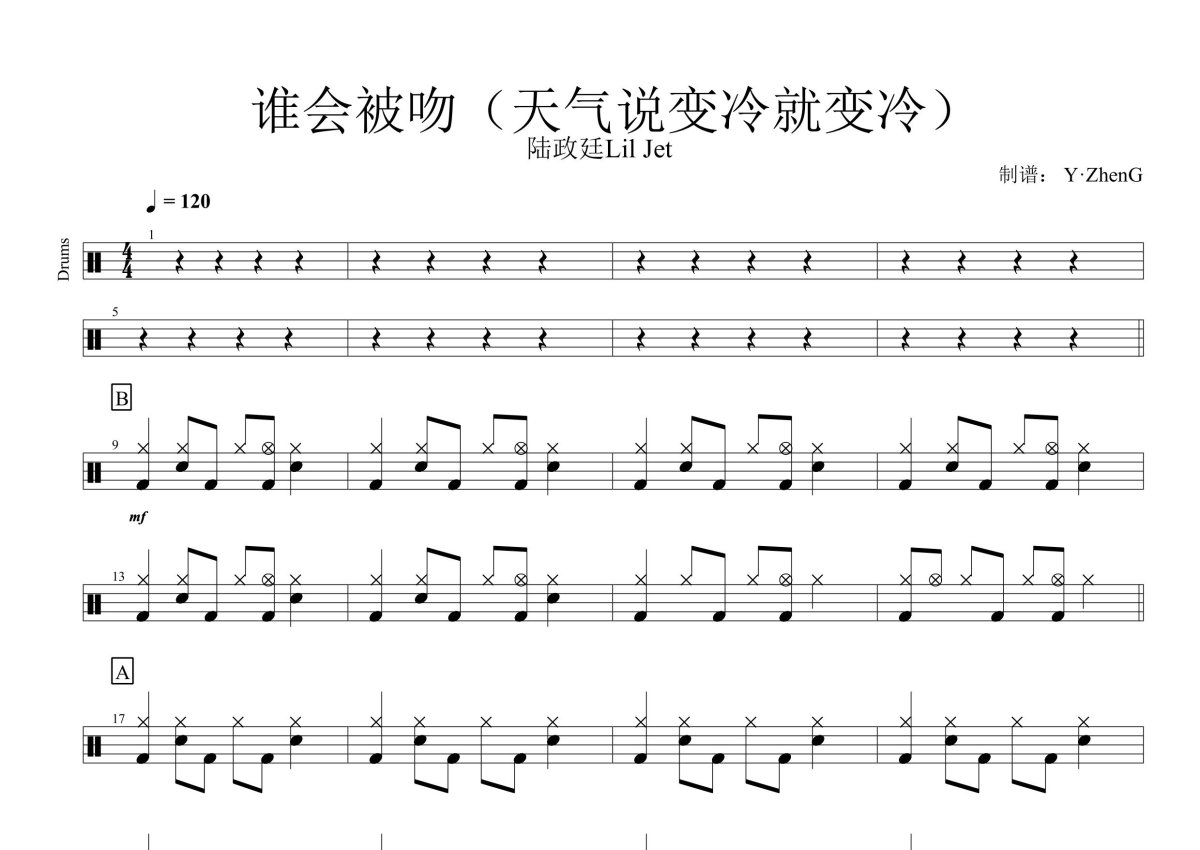 《谁会被吻(天气说变冷就变冷)》是陆政廷Lil Jet演唱的一首歌曲,这份鼓谱共有两张高清图谱,图谱由 @Z.H.E.N.G 编配上传,图谱使用五线谱编配,使用这份谁会被吻(天气说变冷就变冷)架子鼓谱,你将能够轻松地敲打出这首陆政廷Lil Jet的谁会被吻(天气说变冷就变冷),快来尝试吧。陆政廷LilJet《谁会被吻(天气说变冷就变冷)》架子鼓谱,Z.H.E.N.G编配出品,共有2张高清图谱,免翻页排版设计。