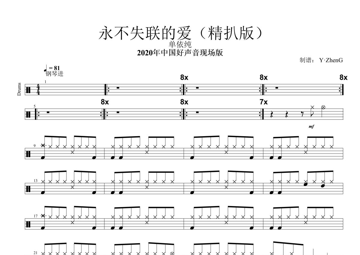 《永不失联的爱(Live)》是单依纯演唱的一首歌曲,这份鼓谱共有一张高清图谱,图谱由 @Z.H.E.N.G 编配上传,图谱使用五线谱编配,使用这份永不失联的爱(Live)架子鼓谱,你将能够轻松地敲打出这首单依纯的永不失联的爱(Live),快来尝试吧。单依纯《永不失联的爱(Live)》架子鼓谱,Z.H.E.N.G编配出品,共有1张高清图谱,免翻页排版设计。