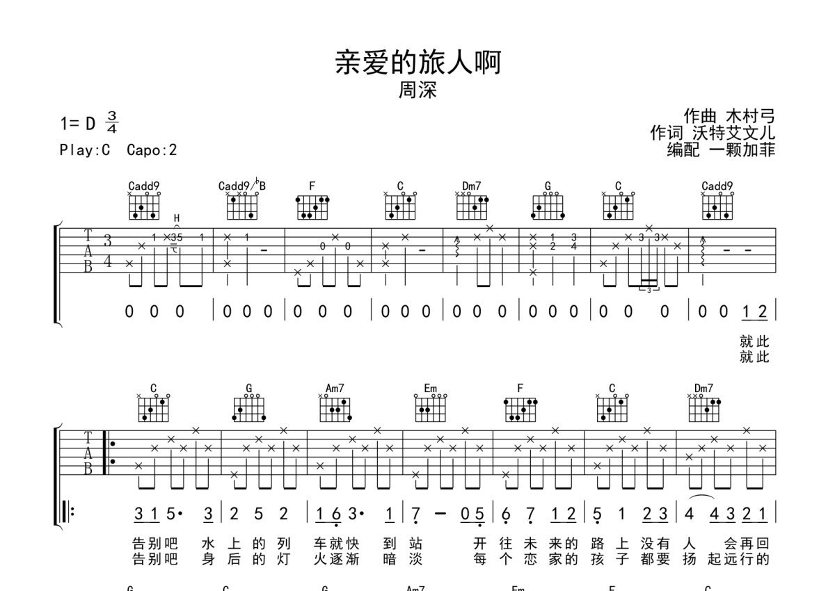 《亲爱的旅人啊》是周深演唱的一首歌曲,完整编配版,本吉他谱采用的是C调指法编配,这份吉他谱共有三张高清图谱,图谱由 @一颗加菲 编配上传,图谱使用六线谱编配,包含吉他和弦指法、简谱以及歌词部分,曲谱配备了相关的音频提供试听,使用这份亲爱的旅人啊吉他谱,可以让你更加方便地掌握这首歌曲的弹唱技巧,快来尝试吧。