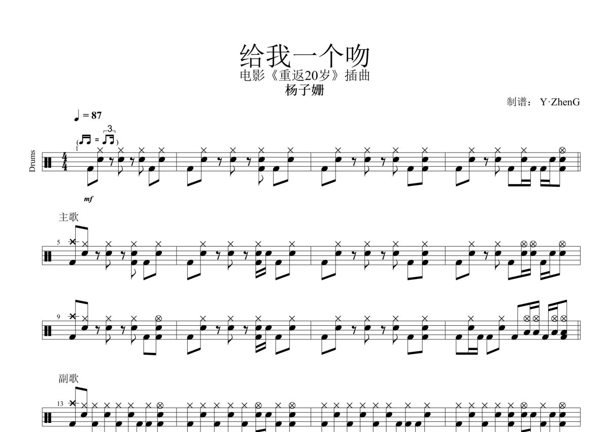 杨子姗《给我一个吻》鼓谱 - 架子鼓谱
