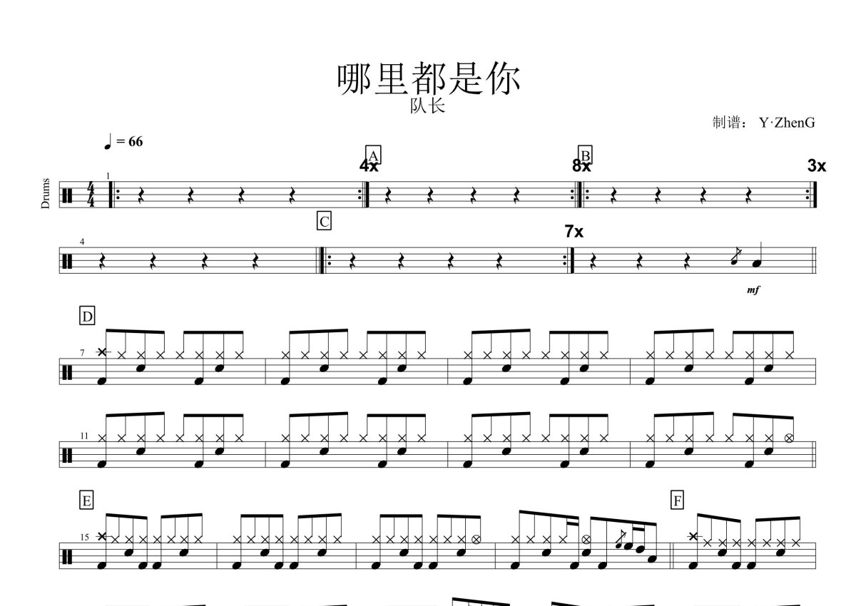 《哪里都是你》是队长演唱的一首歌曲,这份鼓谱共有一张高清图谱,图谱由 @Z.H.E.N.G 编配上传,图谱使用五线谱编配,使用这份哪里都是你架子鼓谱,你将能够轻松地敲打出这首队长的哪里都是你,快来尝试吧。队长《哪里都是你》架子鼓谱,Z.H.E.N.G编配出品,共有1张高清图谱,免翻页排版设计。