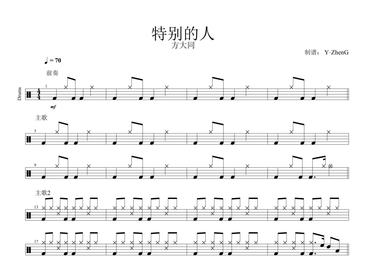 《特别的人》是方大同演唱的一首歌曲,这份鼓谱共有两张高清图谱,图谱由 @Z.H.E.N.G 编配上传,图谱使用五线谱编配,使用这份特别的人架子鼓谱,你将能够轻松地敲打出这首方大同的特别的人,快来尝试吧。方大同《特别的人》架子鼓谱,Z.H.E.N.G编配出品,共有2张高清图谱,免翻页排版设计。