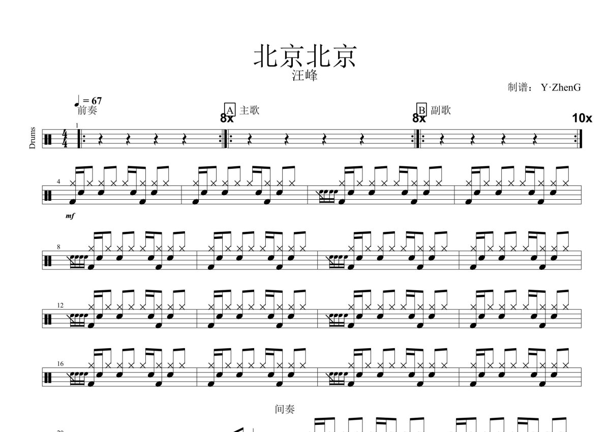 《北京北京》是汪峰演唱的一首歌曲,这份鼓谱共有两张高清图谱,图谱由 @Z.H.E.N.G 编配上传,图谱使用五线谱编配,使用这份北京北京架子鼓谱,你将能够轻松地敲打出这首汪峰的北京北京,快来尝试吧。汪峰《北京北京》架子鼓谱,Z.H.E.N.G编配出品,共有2张高清图谱,免翻页排版设计。