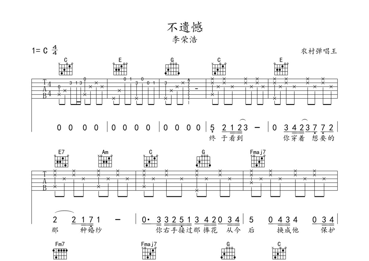 李荣浩《不遗憾》吉他谱 - C调弹唱六线谱