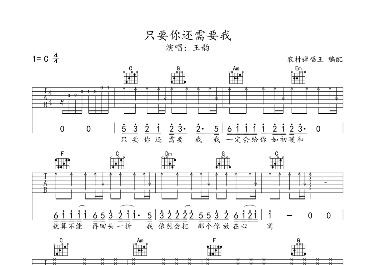 王韵《只要你还需要我》吉他谱 - C调弹唱六线谱