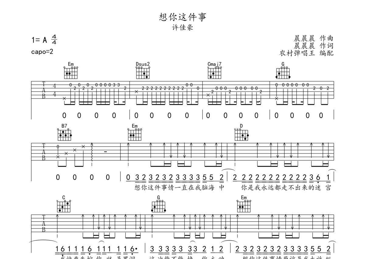 许佳豪《想你这件事》吉他谱 - G调弹唱六线谱