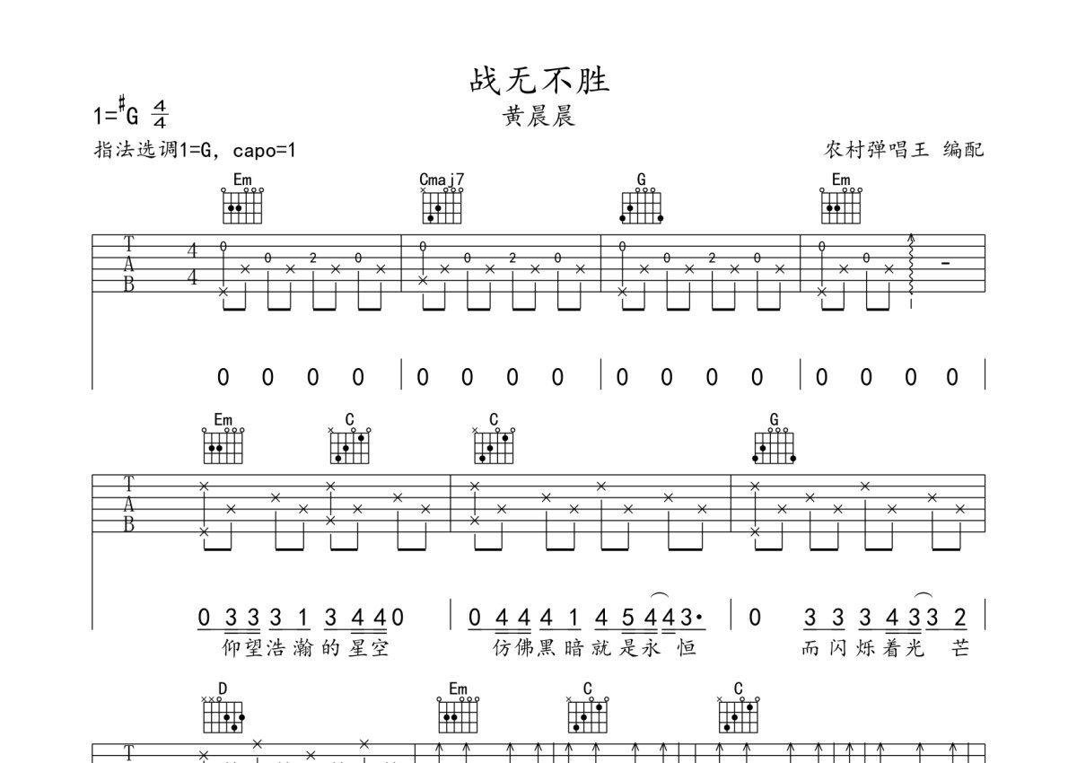黄晨晨《战无不胜》吉他谱 - G调弹唱六线谱