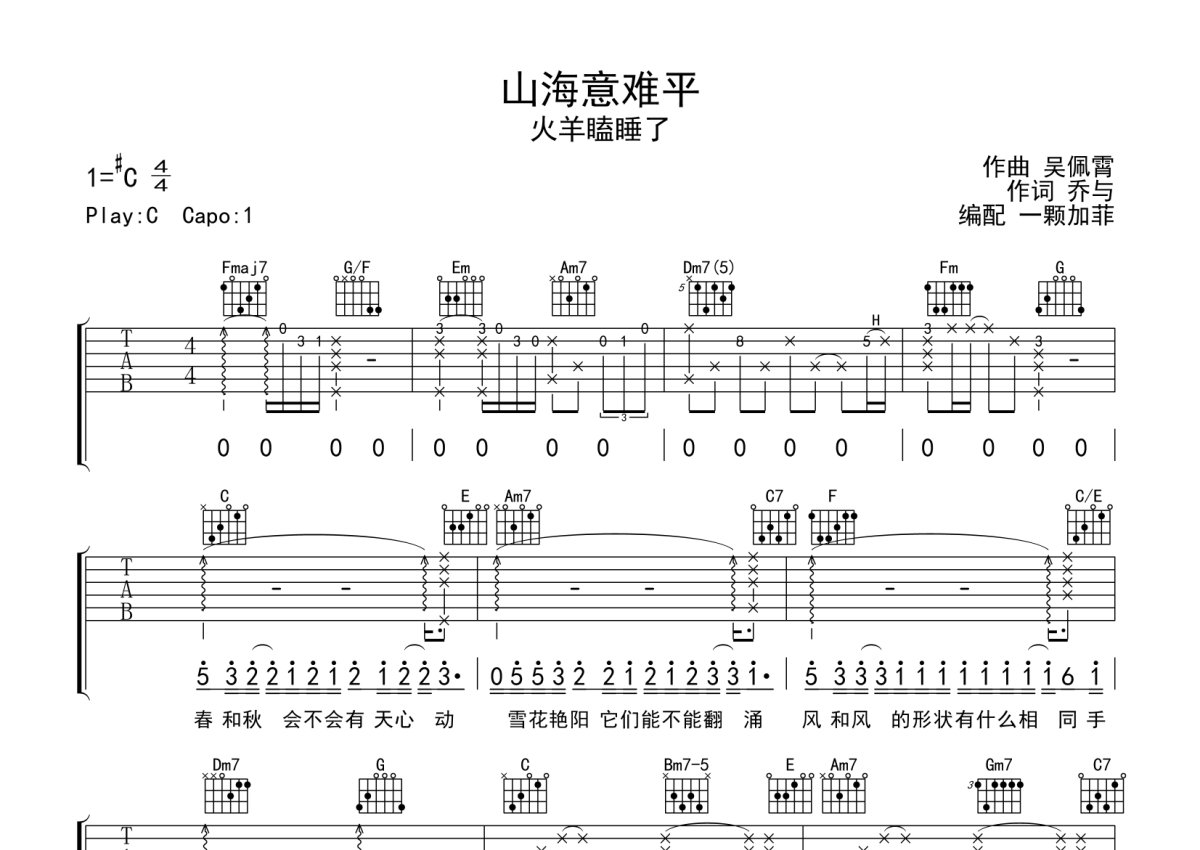 火羊瞌睡了《山海意难平》吉他谱 - C调弹唱六线谱 - 完整编配版