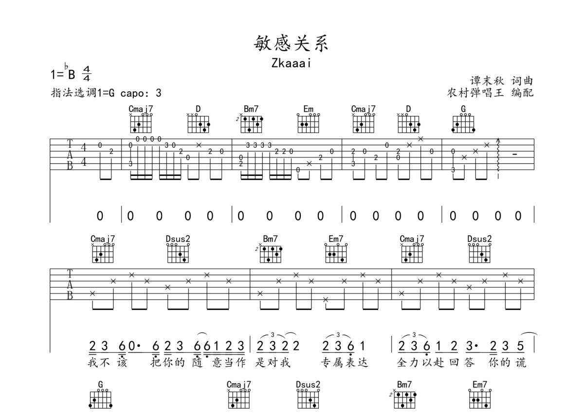 Zkaaai《敏感关系》吉他谱 - G调弹唱六线谱