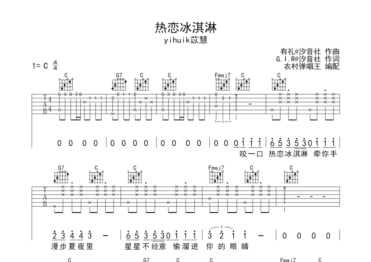 yihuik苡慧《热恋冰淇淋》吉他谱 - C调弹唱六线谱