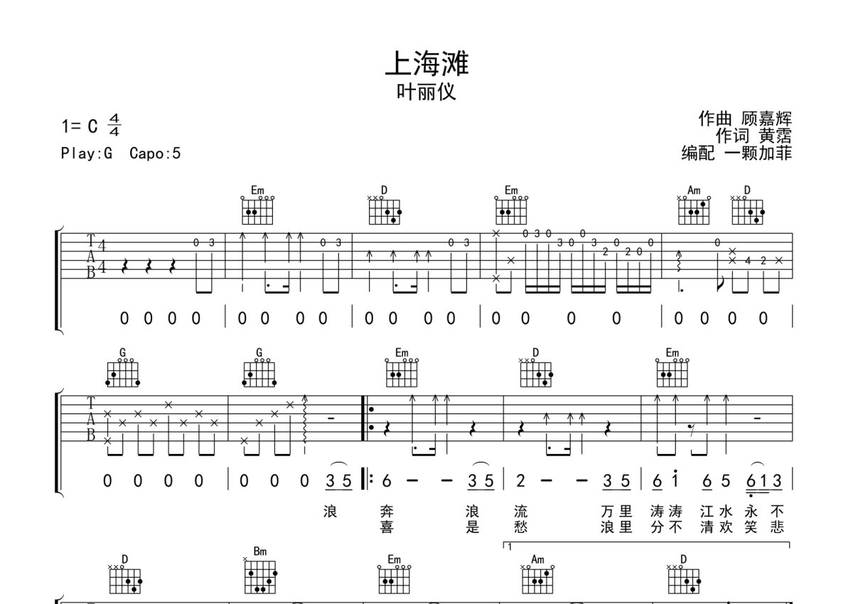 《上海滩》是叶丽仪演唱的一首歌曲,完整编配版,本吉他谱采用的是G调指法编配,这份吉他谱共有三张高清图谱,图谱由 @一颗加菲 编配上传,图谱使用六线谱编配,包含吉他和弦指法、简谱以及歌词部分,曲谱配备了相关的音频提供试听,使用这份上海滩吉他谱,可以让你更加方便地掌握这首歌曲的弹唱技巧,快来尝试吧。