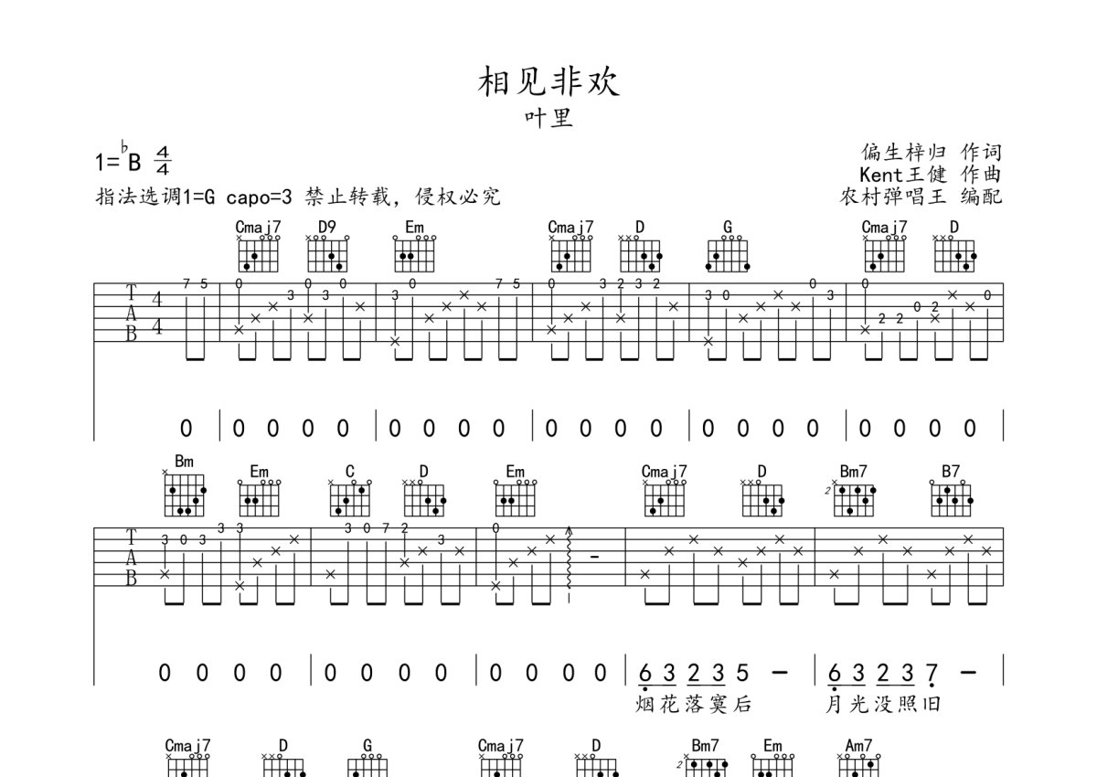 《相见非欢》是叶里演唱的一首歌曲,本吉他谱采用的是G调指法编配,这份吉他谱共有三张高清图谱,图谱由 @农村弹唱王 编配上传,图谱使用六线谱编配,包含吉他和弦指法、简谱以及歌词部分,使用这份相见非欢吉他谱,可以让你更加方便地掌握这首歌曲的弹唱技巧,快来尝试吧。叶里《相见非欢》吉他谱_G调吉他弹唱谱。