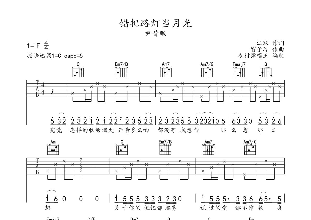 《错把路灯当月光》是尹昔眠演唱的一首歌曲,本吉他谱采用的是C调指法编配,这份吉他谱共有两张高清图谱,图谱由 @农村弹唱王 编配上传,图谱使用六线谱编配,包含吉他和弦指法、简谱以及歌词部分,使用这份错把路灯当月光吉他谱,可以让你更加方便地掌握这首歌曲的弹唱技巧,快来尝试吧。尹昔眠《错把路灯当月光》吉他谱_C调吉他弹唱谱。