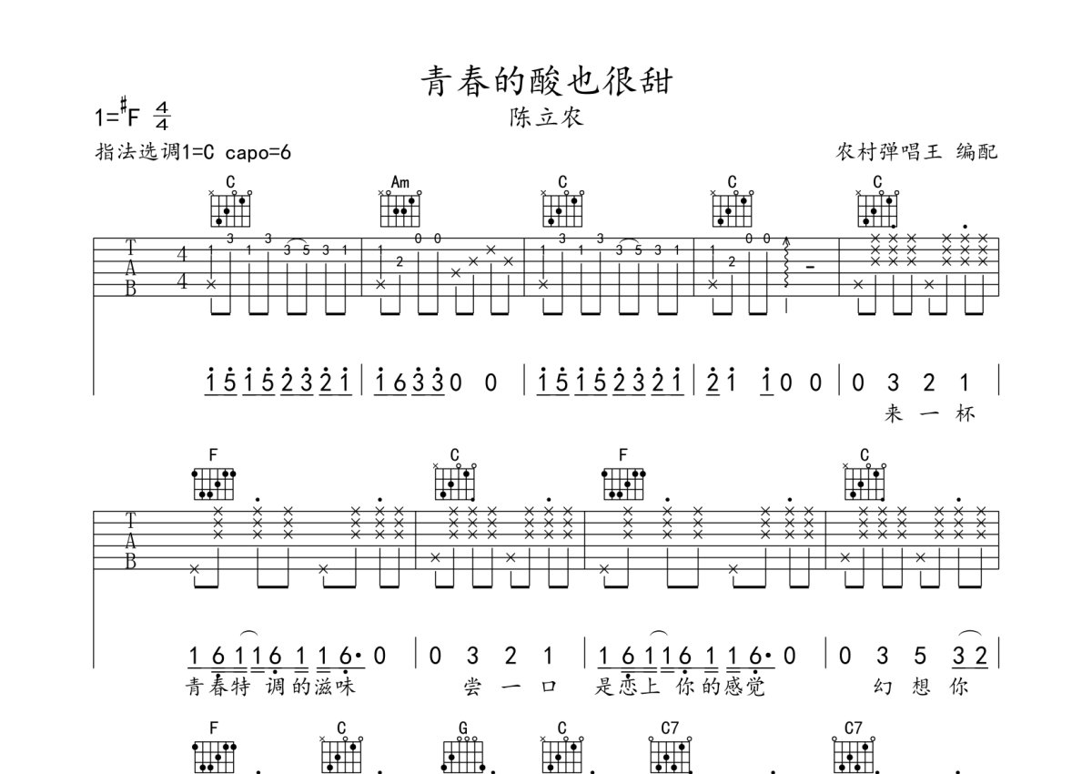 陈立农《青春的酸也很甜》吉他谱 - C调弹唱六线谱