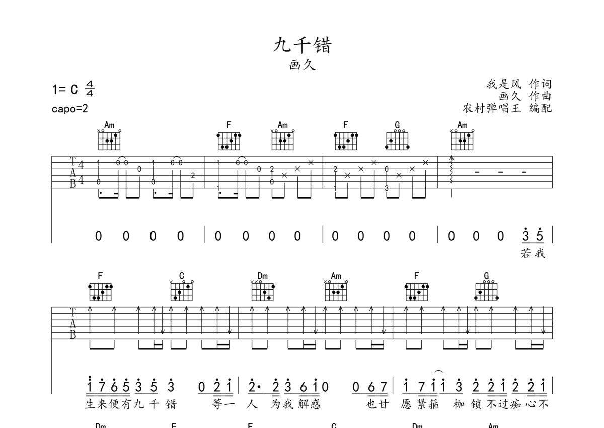 画久《九千错》吉他谱 - C调弹唱六线谱