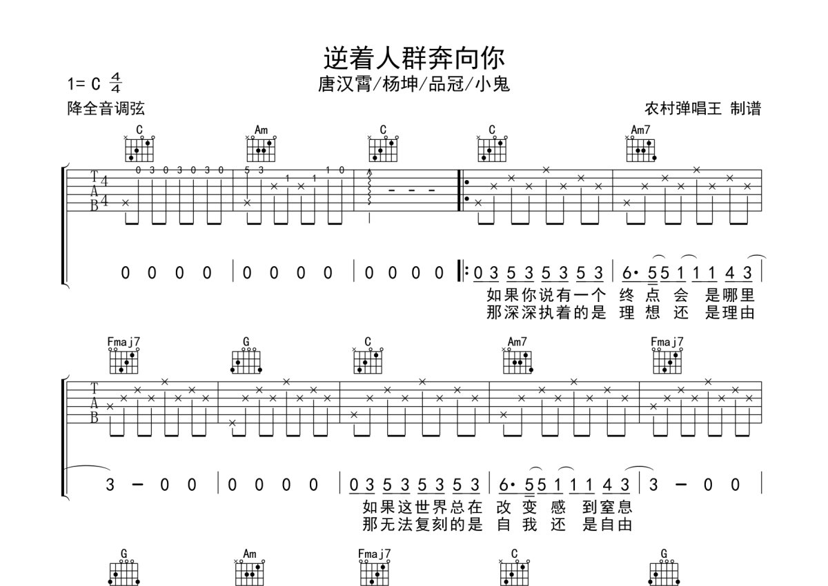 杨坤/唐汉霄/品冠/小鬼《逆着人群奔向你》吉他谱 - C调弹唱六线谱 - 男女通用板